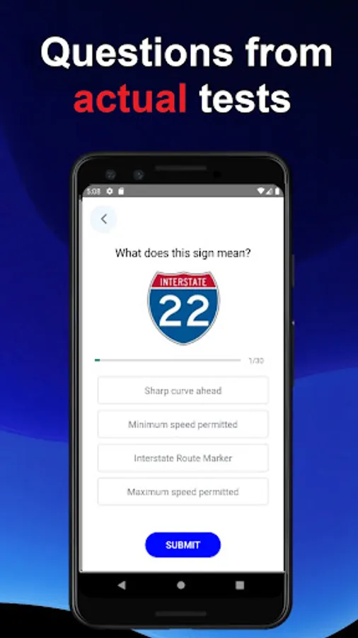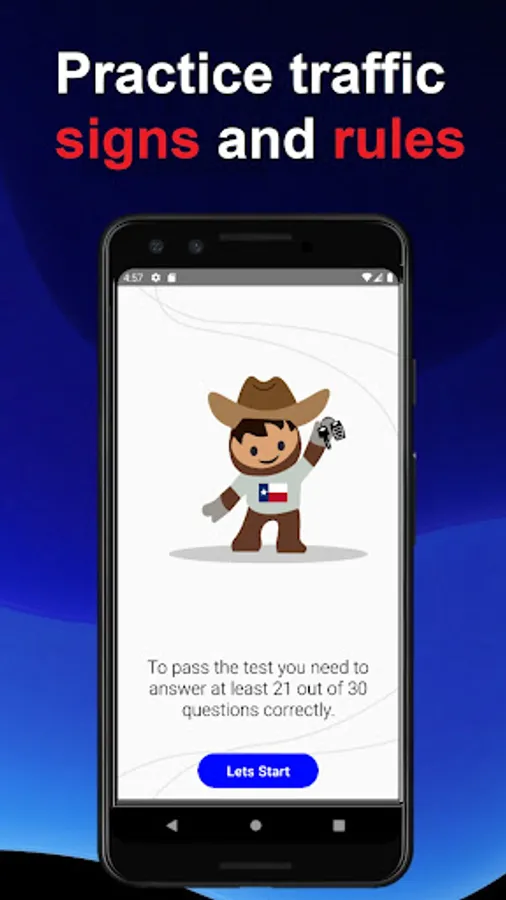During exam you will be given a written or oral examination on your ability to recognize and understand the meaning of highway road signs. You will also be given an examination on the traffic laws and rules for safe driving. This test consists of 30 questions. To pass, you must correctly match 21. This app was developed to help you to pass the Texas DMV permit test and it based on the latest official DMV Driver's handbook. You can practice permit questions offline anywhere and anytime.