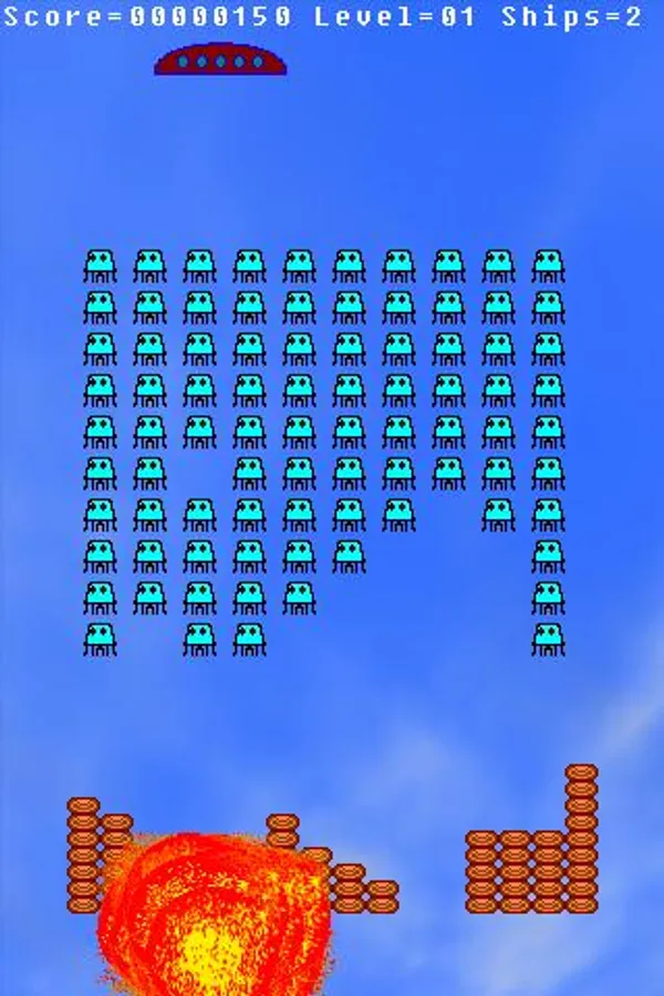 Each level is harder than the previous: aliens shall be more and more aggressive, more enemy missiles shall be fired, and the energy barriers shall be thinner.