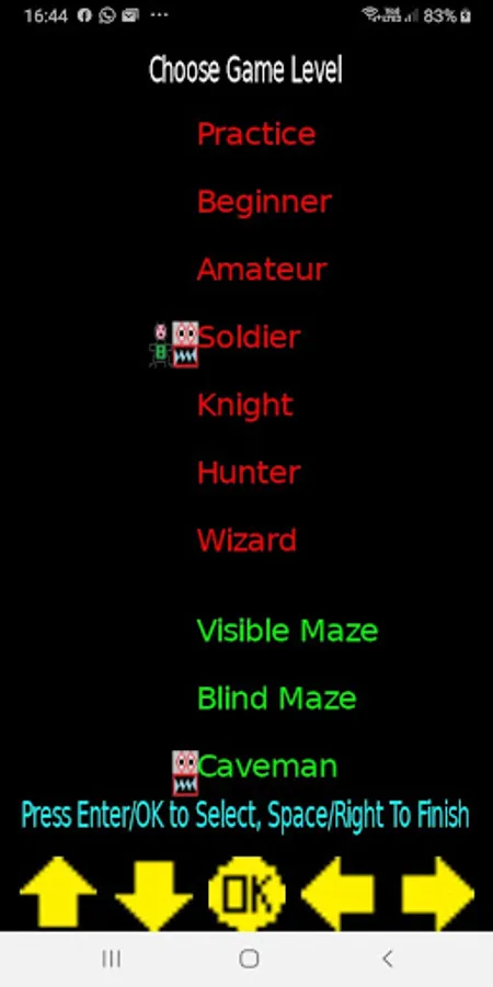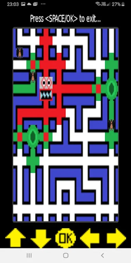There are 7 levels, from practice to really impossible! For each level, you may choose the blind mode (you see only the current cell), normal mode (the already explored cells remain visible) or caveman mode, where a caveman will chase you around the maze.
