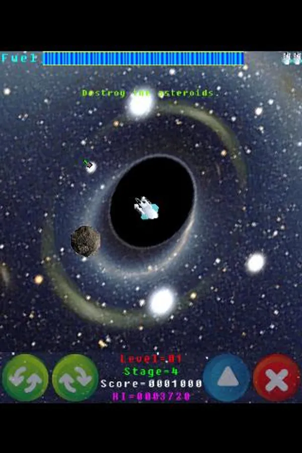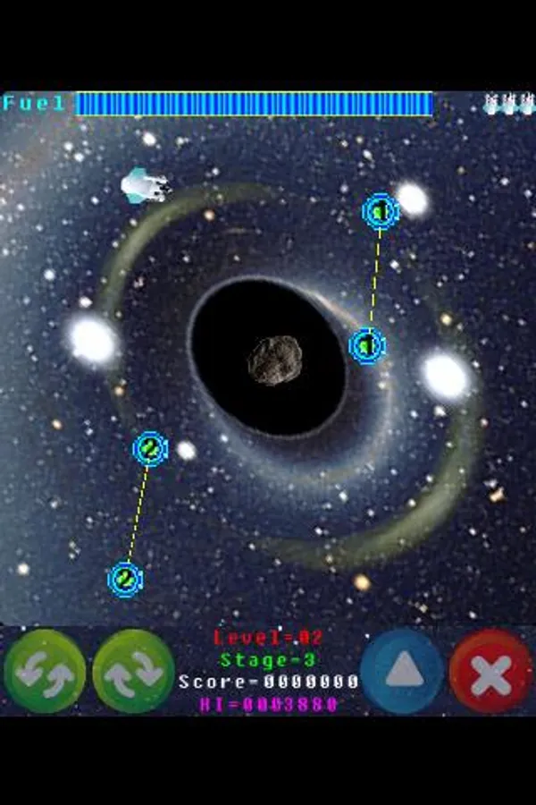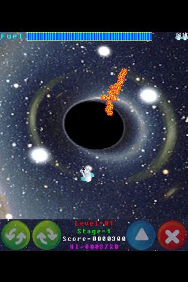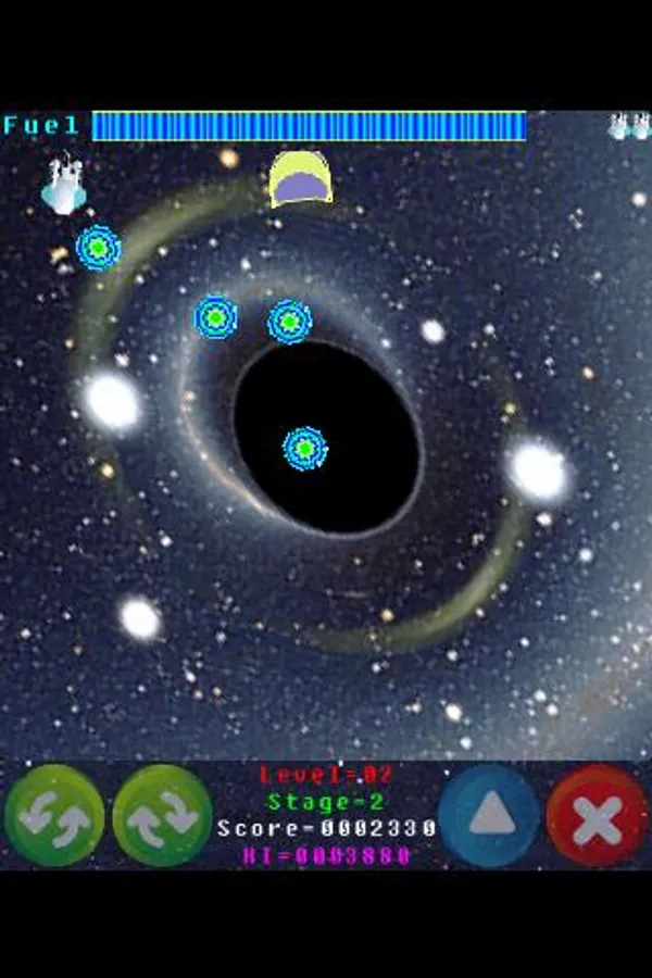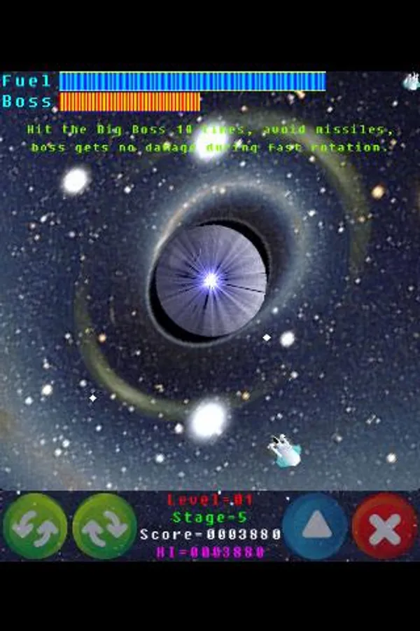 Travel between the stars and battle an alien invasion from a black hole! Black Holes are used as a intergalactic tunnels by an aggressive alien race, determined to conquer the Earth and enslave the human race. Hold on to killer satellites, deadly spheres, asteroids and a terrible and huge bosses, under the ubiquitous influence of the black hole. Cross the energy barrier created by the enemies while avoiding the collision with their spaceships. Use 4 soft keys to rotate to the left and right your space shuttle, to enable the rockets and to fire the missiles. Attention to fuel efficiency when using rockets, if you run out you will be forced to wander under the gravitational influence the black hole at the mercy of your enemies.