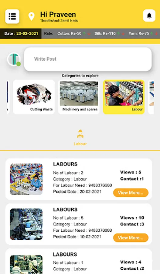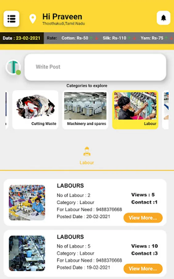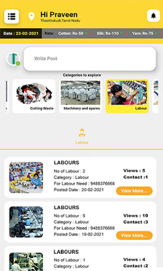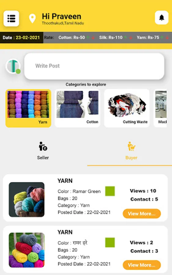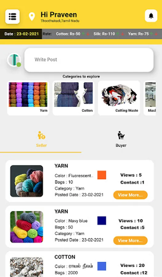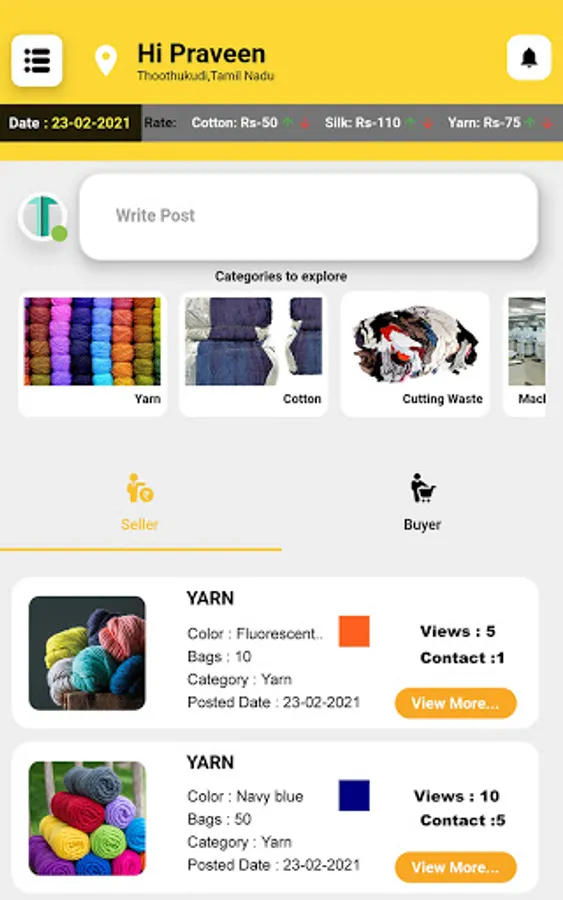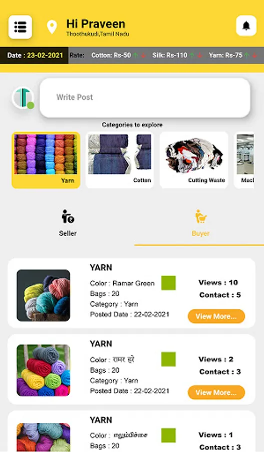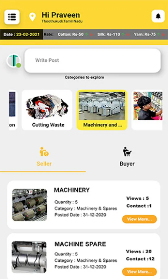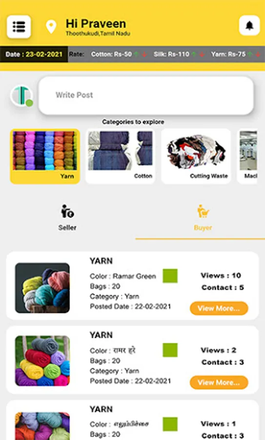 Texmaart is a platform for complete textile trading. Primarily, Texmaart connects the buyers and sellers of different geographical locations in India. Texmaart deals predominantly over all the required nuances between the buyers and sellers. The key categories that helps the buyer-seller are Cotton, Yarn, Cutting Waste, Labours, Electricians, Fitters, Transport, etc..