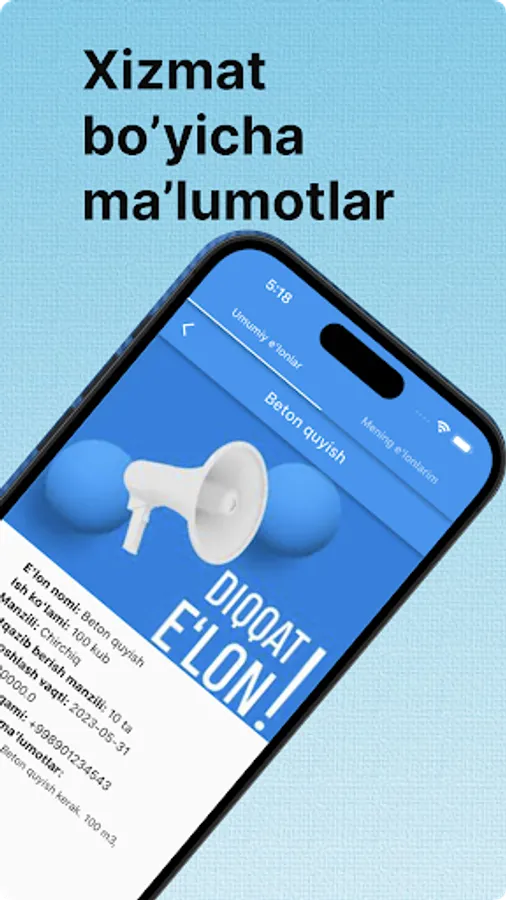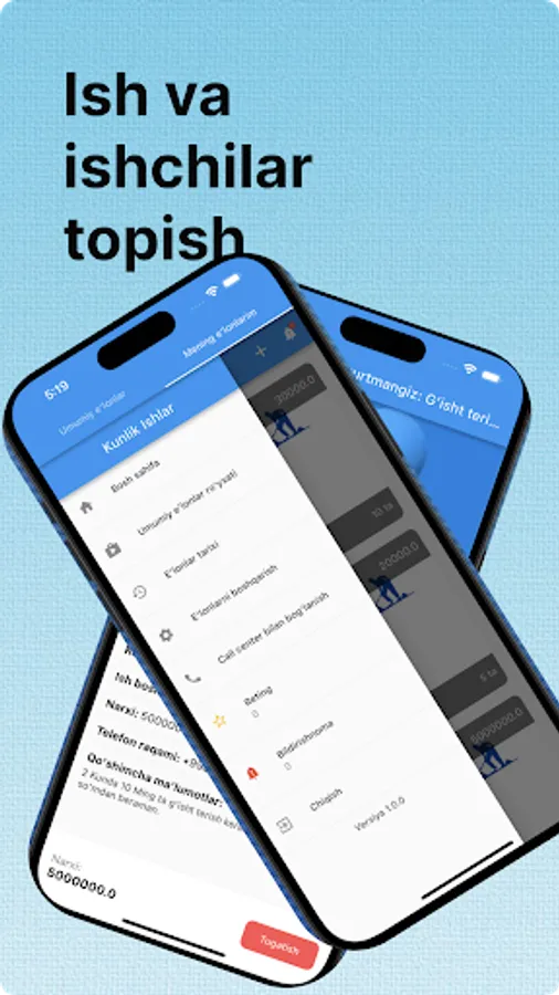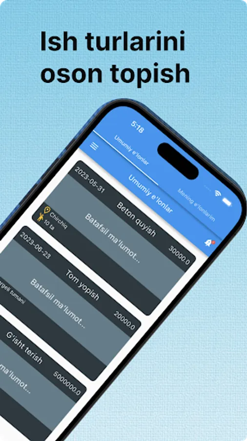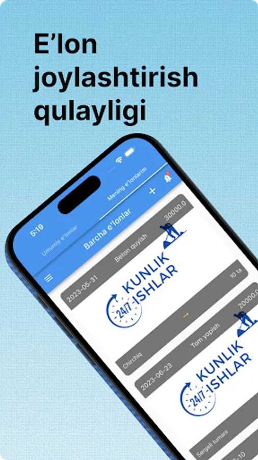 Mehnat bozorini ishtirokchilari va foydalanuvchilarga qulaylik yaratish maqsadida "Kunlik Ishlar" mobil ilovasi yaratildi. Siz ishlarni va ishchilarni topishingiz mumkin. Malakali mutaxasislar qisqa vaqt ichida ishlarni sifatli amalga oshiradi.