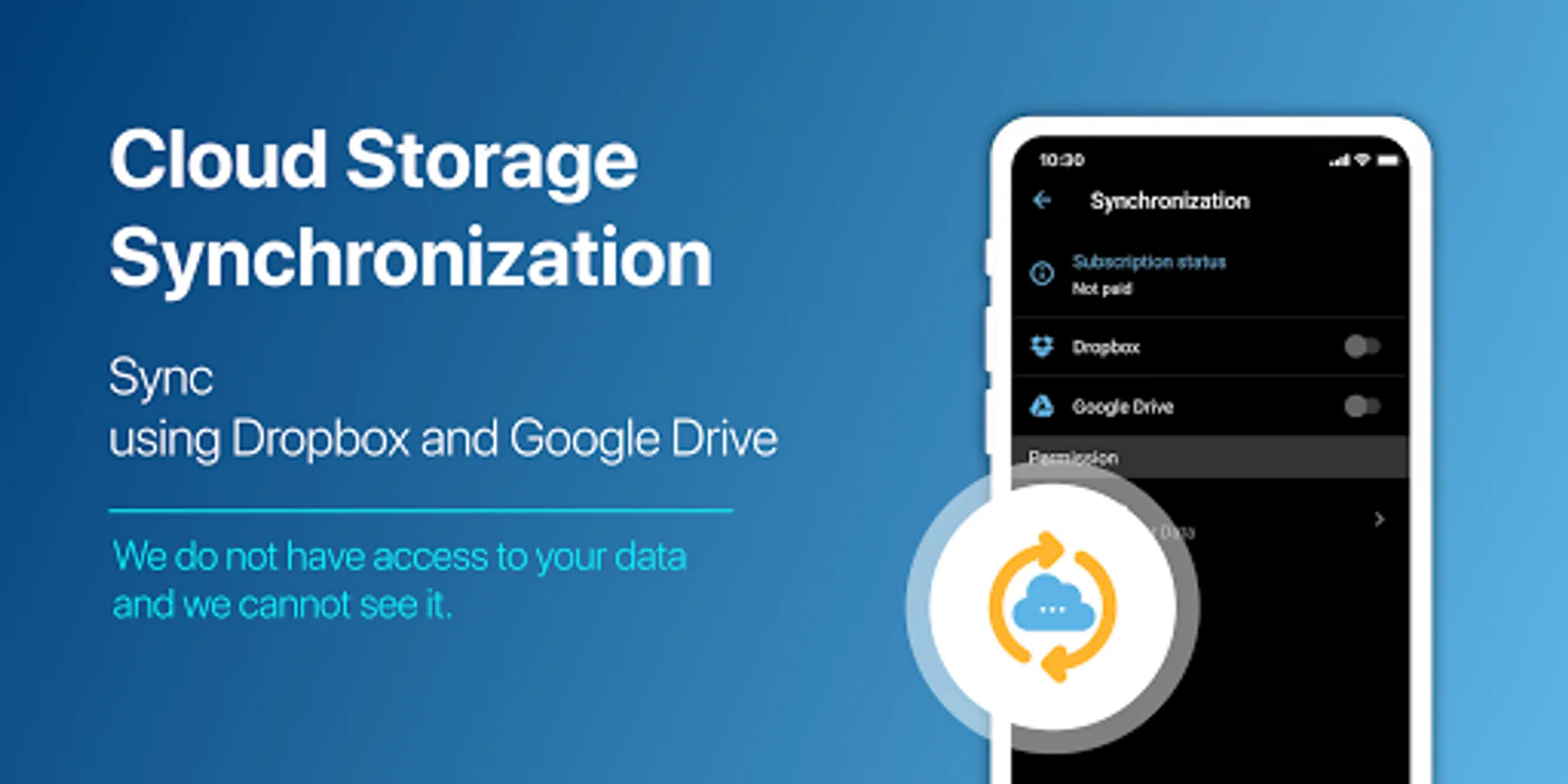 Use our app on multiple devices by connecting your Dropbox and Google Drive cloud storage. We do not have access to your data and do not see them. Use synchronization to keep your data relevant on all devices!