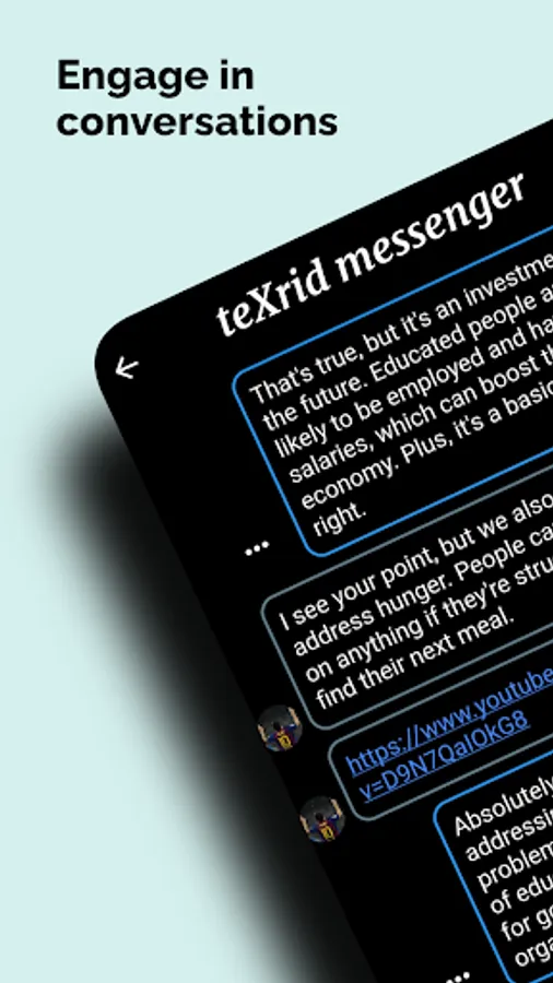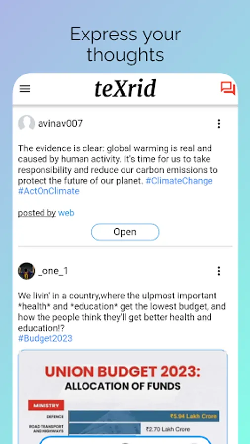 At teXrid, we believe in the power of self-expression and connecting with others. That's why we've created a user-friendly platform that makes it easy for you to find the topics that interest you and share your voice with the world. Every post on teXrid comes equipped with a chat button, allowing you to dive deeper into the discussion and exchange ideas with others.