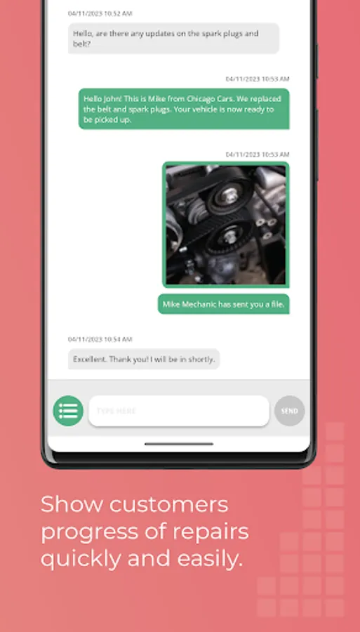 An extension of the Text2Drive communication platform, the Mobile Operations Module allows dealership employees to chat with customers and send them photos (typically of a required repair).