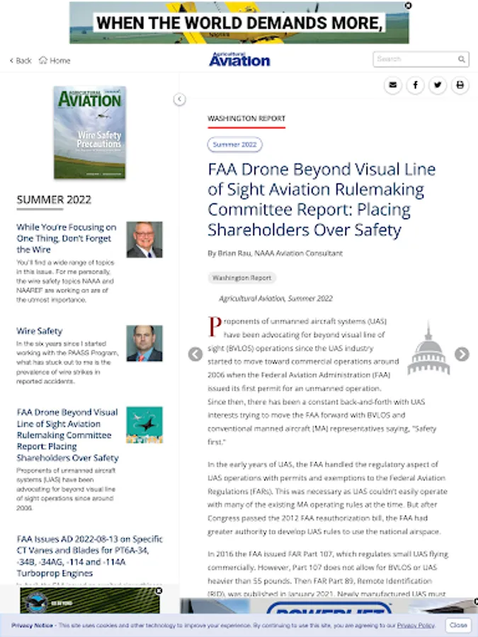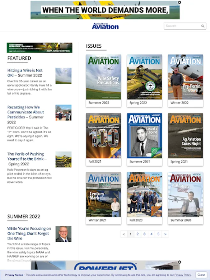 As the official publication of the National Agricultural Aviation Association, Agricultural Aviation magazine is the premier source for scientific research and technological information, business services, industry trends, NAAA association services, and regulatory and legislative activities related to the agricultural aviation industry.