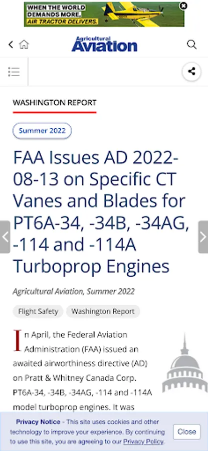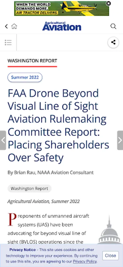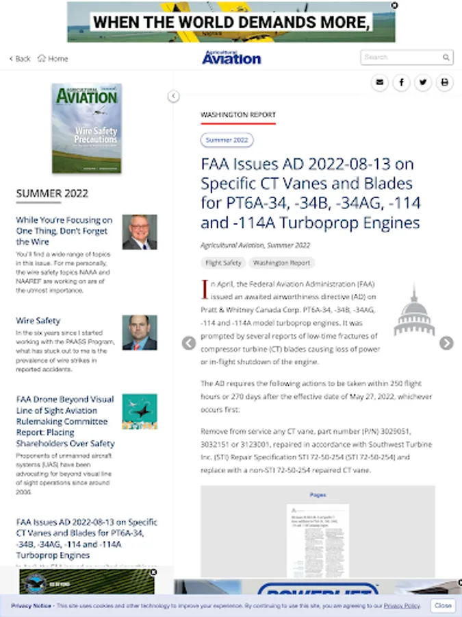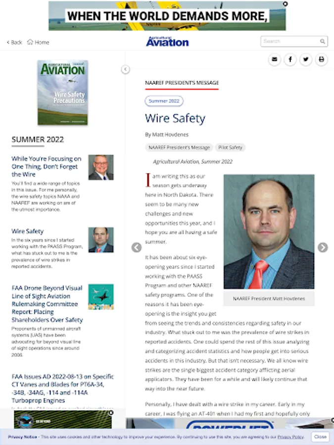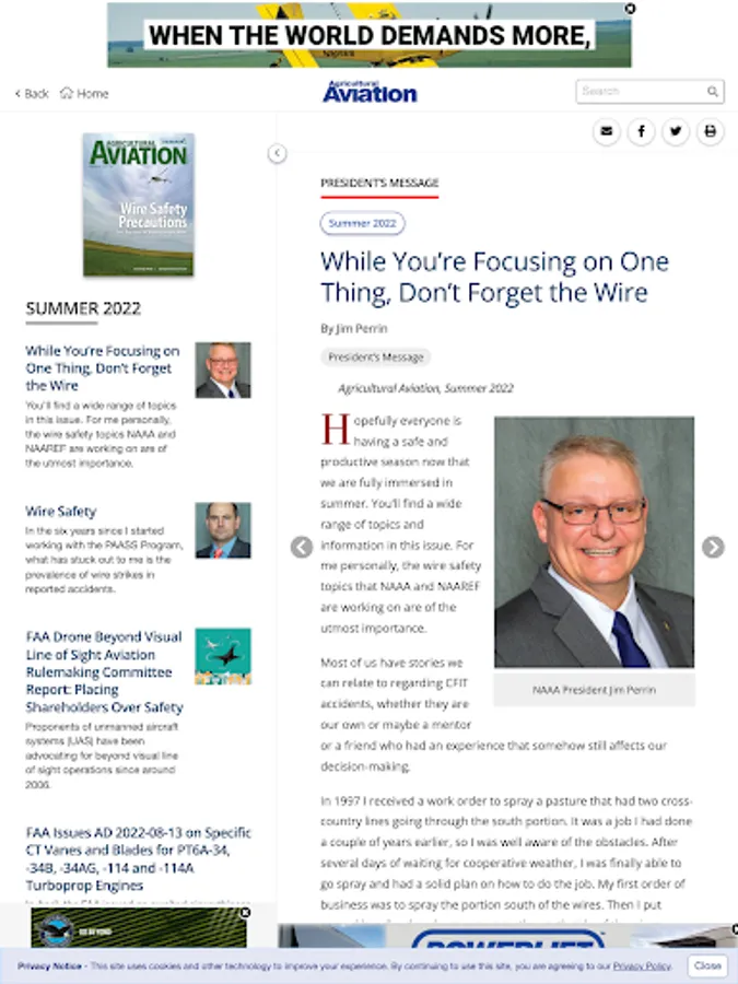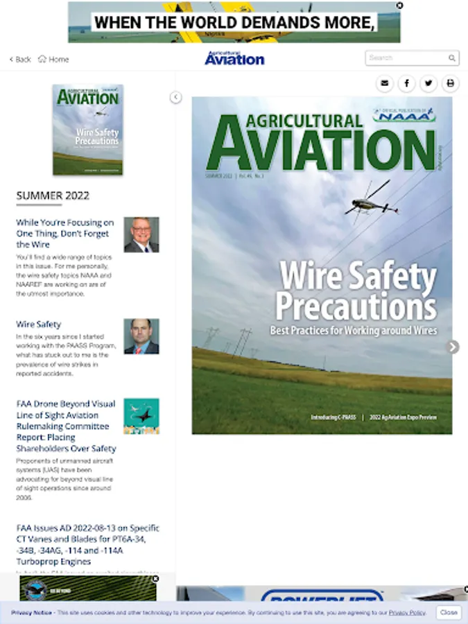 Agricultural aviation is an important part of the overall aviation and agriculture industries. Whether you are in the industry or simply interested in learning more about it, with NAAA’s Agricultural Aviation magazine app, you’ll be able to enjoy the industry’s premiere magazine whenever and wherever you want, right on your mobile device. You won’t just be getting a replica of the print edition either. The digital-friendly format of the Agricultural Aviation magazine app delivers a superior reading experience by adapting content to your device. Trust us, it’s pretty sweet. And it’s free!