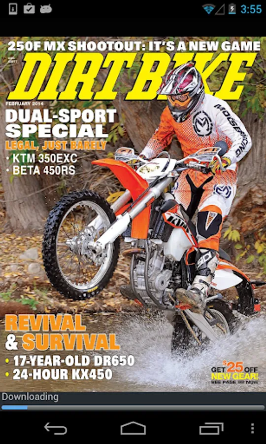 DIRT BIKE Magazine covers the entire world of off-road motorcycling. It’s the NUMBER-ONE title in the field (and has been for over 40 years!). We ride and test ALL of the latest bikes, as well as all of the hop-up parts and accessories made to upgrade your bike and help you go FASTER. We tell you what the hot set-ups are for every bike available. We cover EVERYTHING in the sport: Moto, desert, woods, dual-sport, and adventure bikes too! We give you how-to's on setting up and repairing your bike, and riding tips from the top riders. All this, plus complete race coverage, from MX, SX and EnduroCross to the GNCC, WORCS, and H&H series. See what's happening in the off-road world. This App gives you the mobile flexibility to read and purchase issues and download to your device. Issues purchased in the App have enhanced features, including special video coverage on races, bikes, products, plus links to all manufacturers' websites. 12 issue subscription (one year) for $8.99. Download the current issue or back issues for $2.99 each.