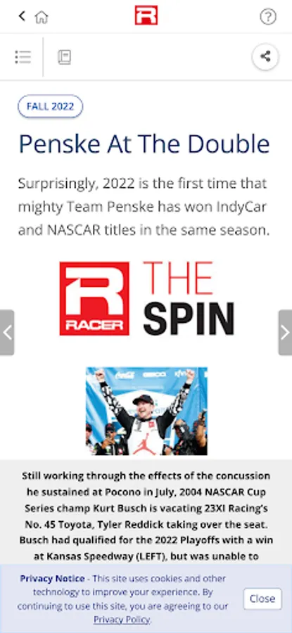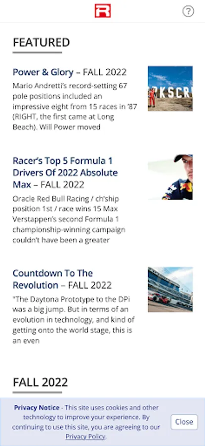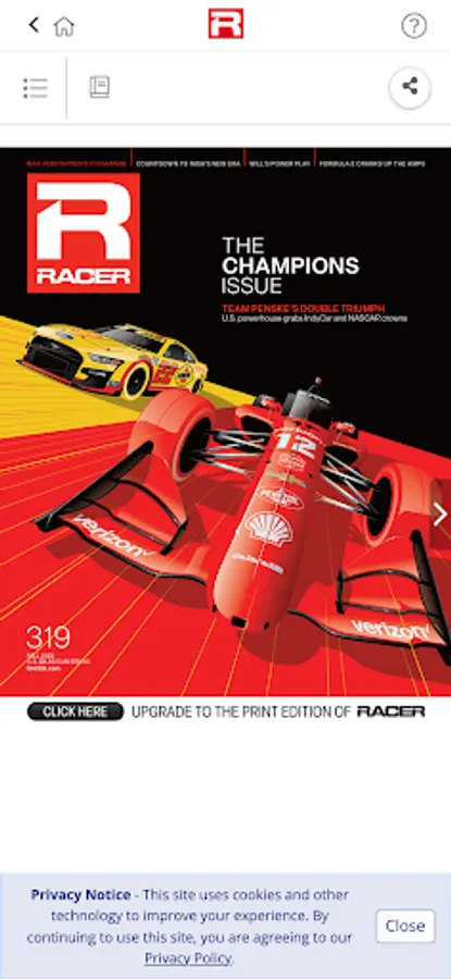 The RACER app provides access to a full-version digital edition of the magazine. Single issues are only $4.99 (print edition is $8.95). An auto-renewing subscription is only $19.99 for one year (8 issues).