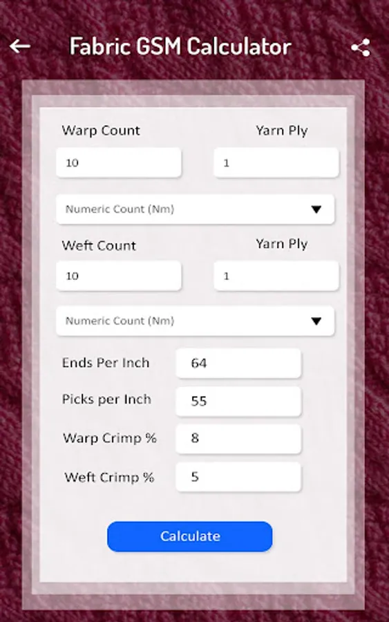 Fabric GSM Calculator: By putting counts,epi,ppi and crimp% you can calculate GSM and oz/yd2 of the fabric