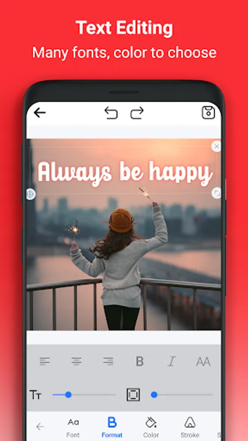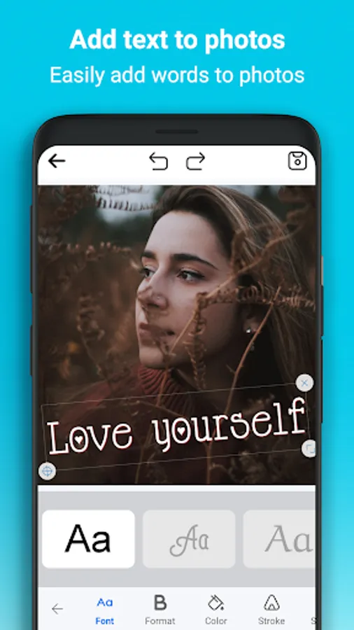 Quickly add text to photo with Text on photo, easily insert your favorite quotes. Create beautiful lovely quotes with text and creative typography sticker. Create lovely quotes, romantic quotes and send to your beloved every day, let’s try text on photo now.