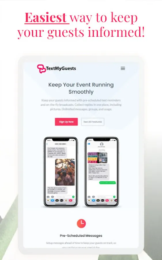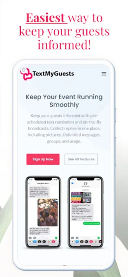 TextMyGuests is a mobile application designed to ease the stress of wedding planning and coordination. Our service allows users to schedule an unlimited number of messages to their guests to keep them informed.