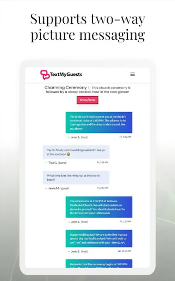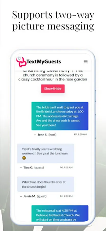 Better yet, TextMyGuests supports two-way, multimedia messaging. Your guests will be taking pictures throughout your event, many of which you may never see. With TextMyGuests, you can collect all the pictures your guests took at your wedding in one simple place. You can even share the “Reply Stream” with your guests, so they can enjoy the pictures as well!