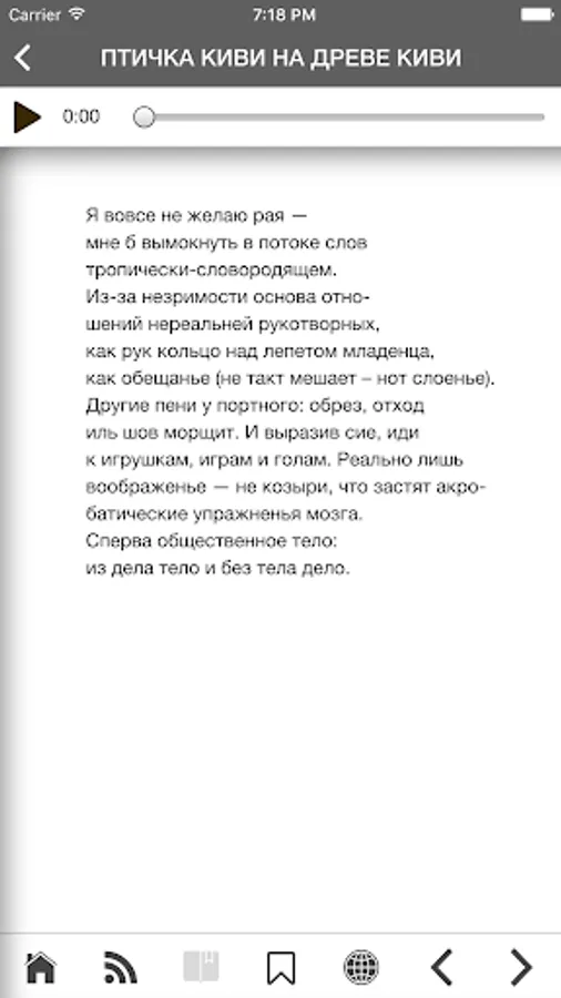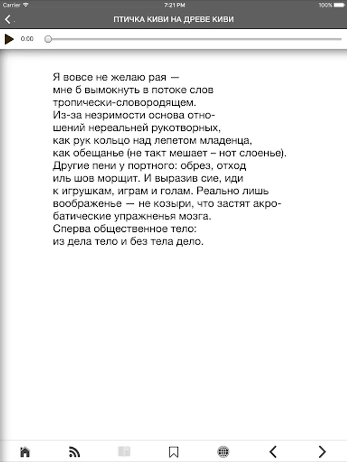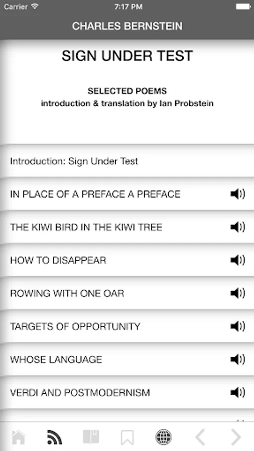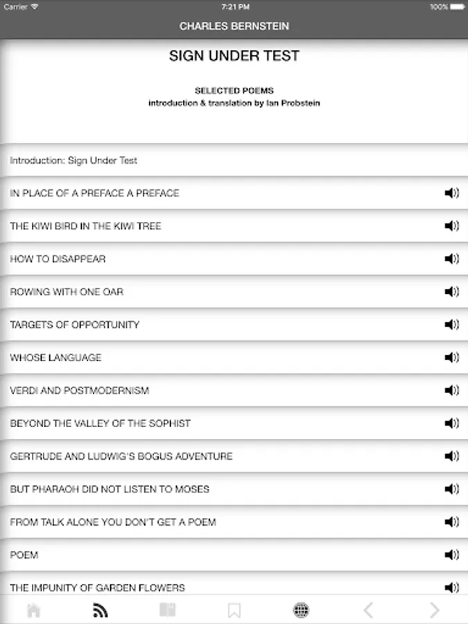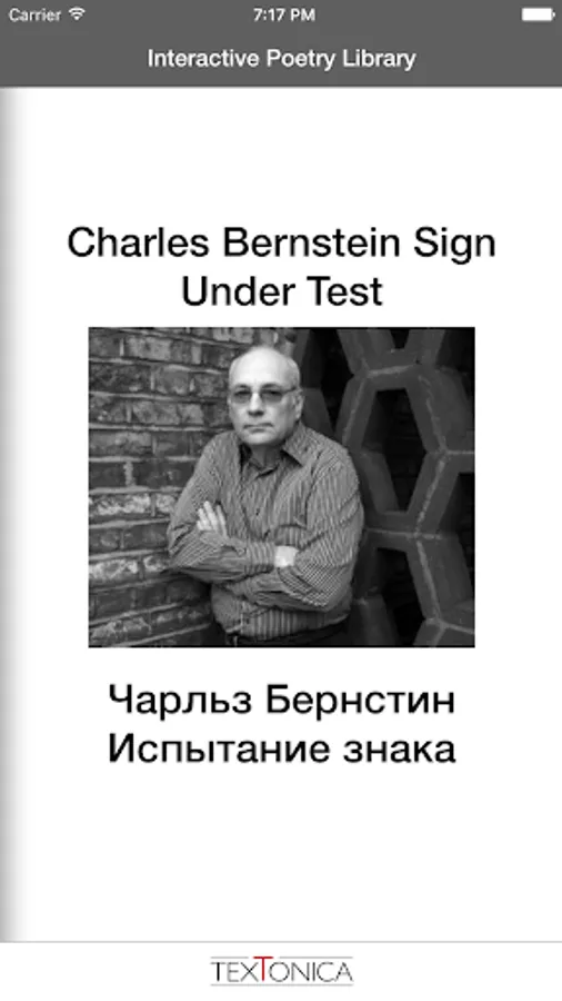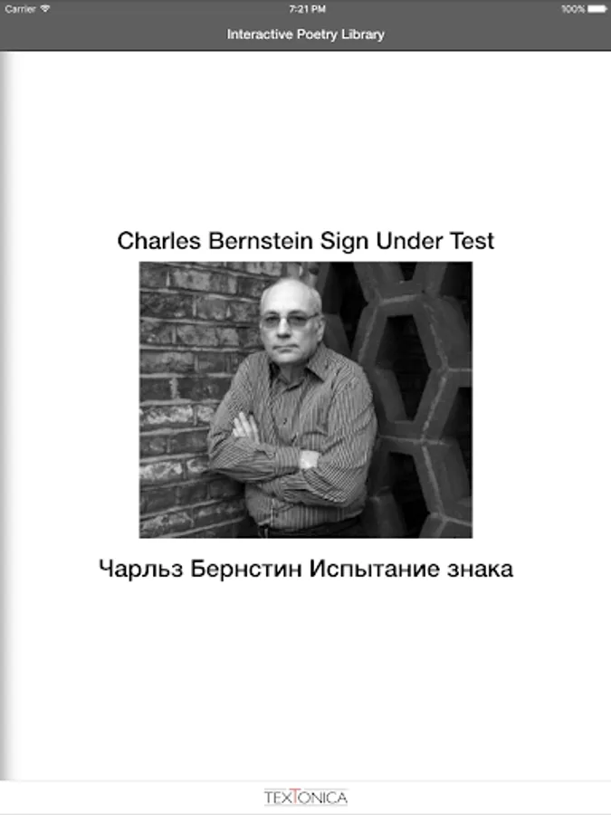 This app is a multimedia collection of works by famous American poet Charles Bernstein ( Чарльз Бернстин) along with their translations into Russian by prominent poet and translator Ian Probstein ( Ян Пробштейн).
