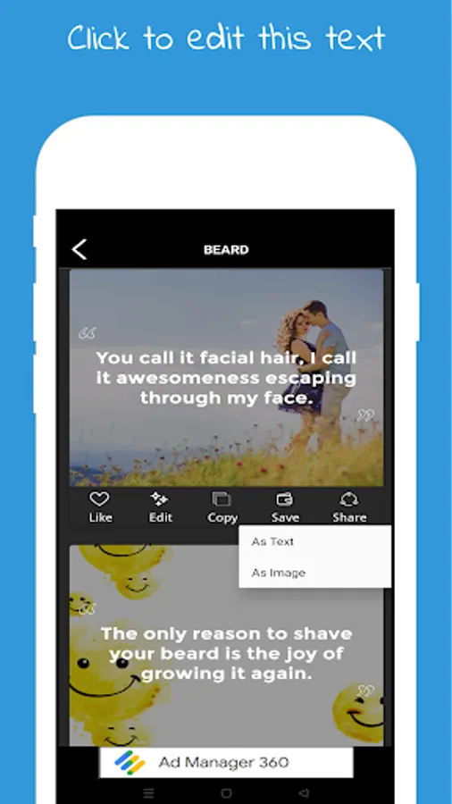 Share your thoughts or words with the image. Create beautiful text images and inspirational sayings for Instagram. Add poems or quotes to a photo and share your thoughts on Instagram. You can also add your own watermark, logo and QR code on the image. Quotes Creator is the best and easiest way to create and share your quotes with the world. Ready to use quote maker with customization options like background, text colors, text size and fonts, or you can choose your photo from photo gallery to use as wallpaper. screen so you can share your quotes with your friends. Quote Maker is perfectly built with good design (UI) and user experience. After customizing your quote, you can save/share with the world via Instagram, Facebook, Twitter, WhatsApp or other apps.