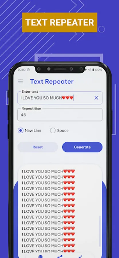 Worried about the hassle of copying and pasting text multiple times? Don't be! The word repetition app simplifies the process with an intuitive interface that allows you to enter your desired text, specify the number of repetitions, and instantly generate the repeated text with just a tap. Whether you're preparing bulk messages, creating templates, or simply need to repeat text for any reason, the text repeater application is your go-to solution.