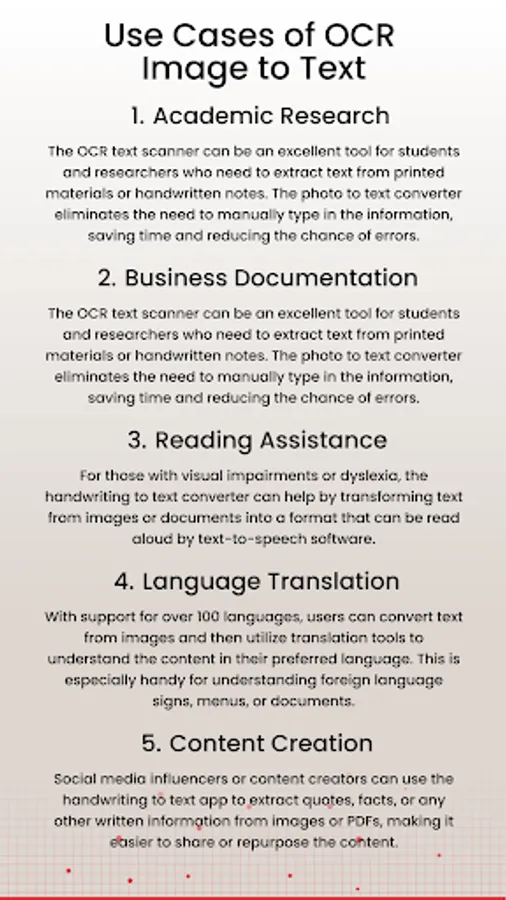 The OCR text scanner can be an excellent tool for students and researchers who need to extract text from printed materials or handwritten notes. The photo to text converter eliminates the need to manually type in the information, saving time and reducing the chance of errors.