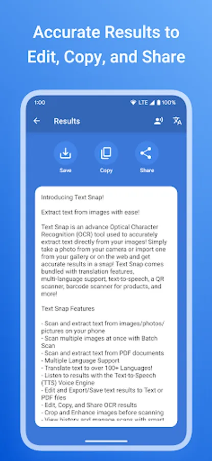 Text Snap is an advance Optical Character Recognition (OCR) tool used to accurately extract text directly from your images! Simply take a photo from your camera or import one from your gallery or on the web and get accurate results in a snap! Text Snap comes bundled with translation features, multi-language support, text-to-speech, a QR scanner, barcode scanner for products, and more!