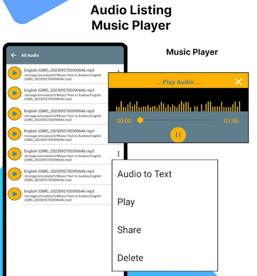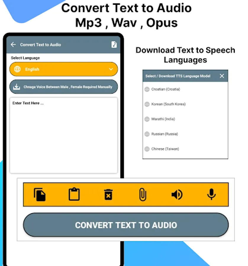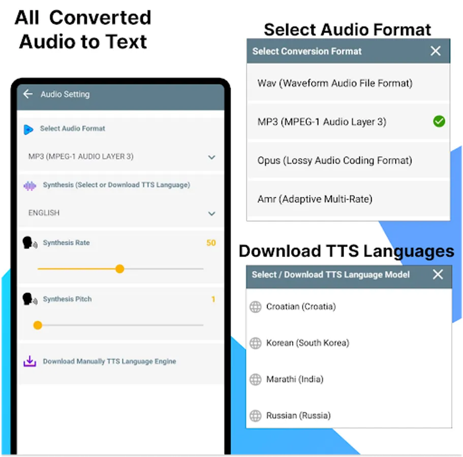 Now a day it is mostly necessary to convert text to audio with audio different format. And also need some time to convert audio to text and extract text from audio file. So we bring such a nice tool which converts text to audio with multiple format support mp3, wav, opus, amr. The app converts text to audio with multiple formats and supports more than 50+ TTs languages.