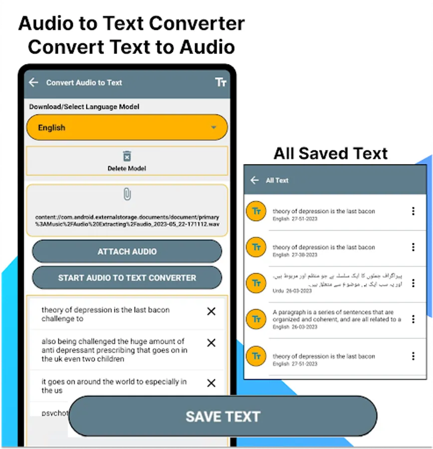 With this nice Audio to Text Converter for android you can easily convert any type of audio to text means extract text from audio file and create txt file of audio. This feature supports more than 10+ languages like English, China, Turkey and other languages to convert audio to text format.