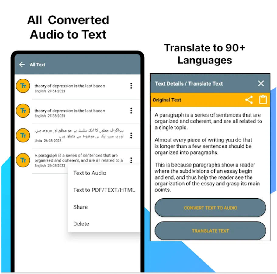 Most of the time you need to convert text to audio in multiple languages, the app also has the feature to translate any text to 90+ languages in seconds. So you can easily convert text to audio with multiple languages.