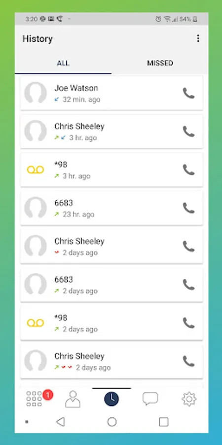 - Call history with a list of received, missed and dialed calls, and integrated in the native history