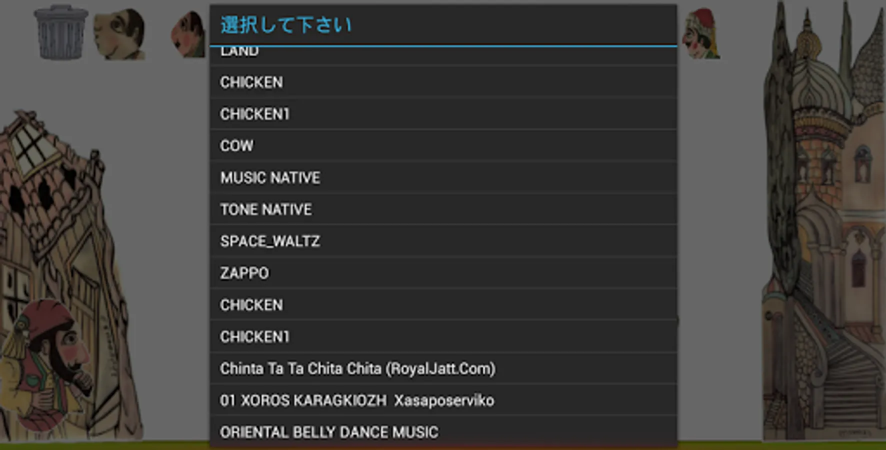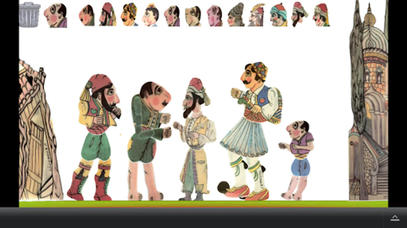 The user is able to select and play for each of the 12 figures a sound or a musical piece. The choice of sound, for example Karagiozis made as follows: First, the user presses the icon with the face of Karagiozis. This action has the effect appears in the left part of the screen the person Karagiozis slightly enlarged and a bucket