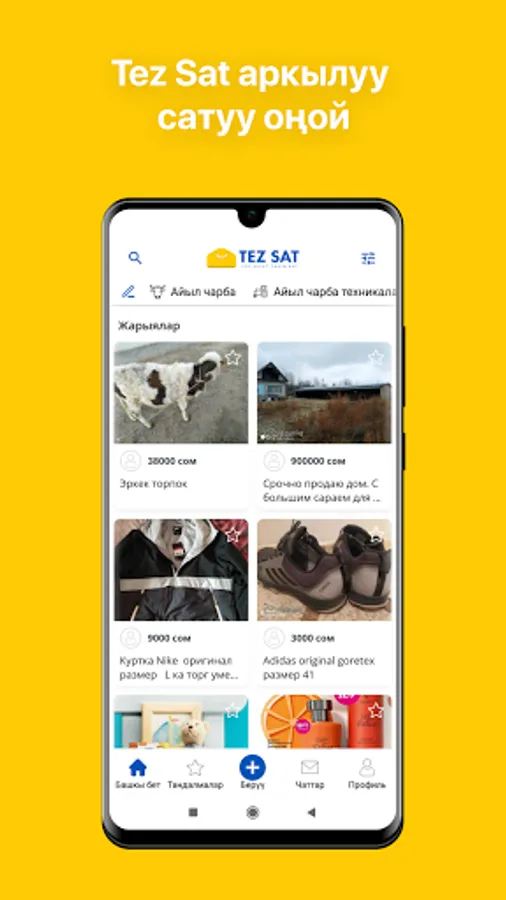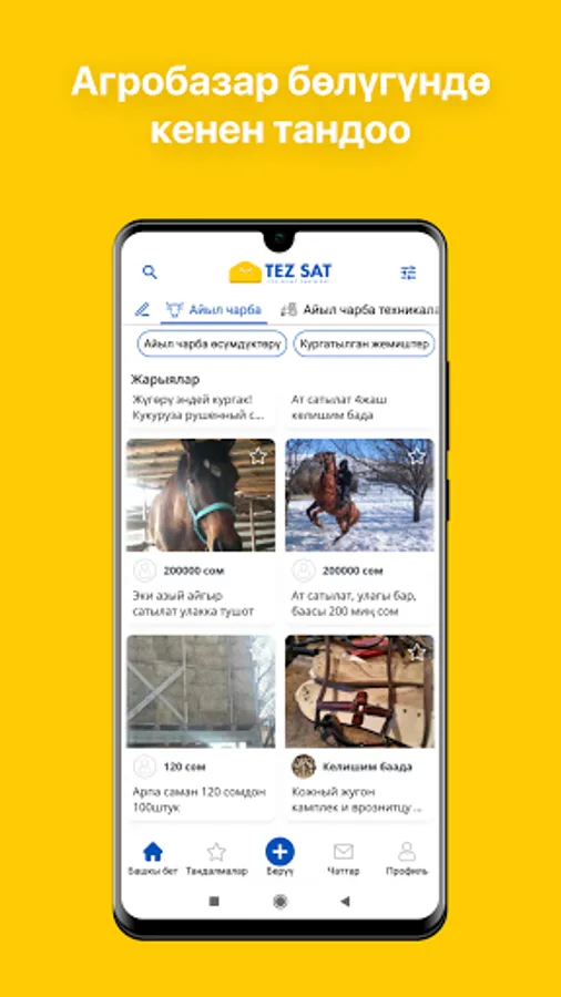 At Tez Sat, you can find meat, dairy products, dried fruits, homemade eggs, bee products and fish products. There are departments for fertilizers, seeds, fodder, seedlings and farm shops, which are necessary for growing crops.