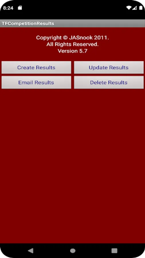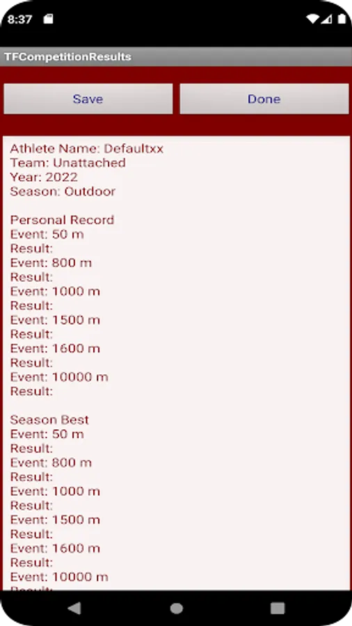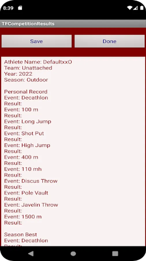 Personal Records, Season Bests, and Meet Results are provided. Competition Results be created and saved by entering a non-default (Defaultxxx) Athlete Name. Using other Menu selections, results can be viewed, updated, or totally deleted.