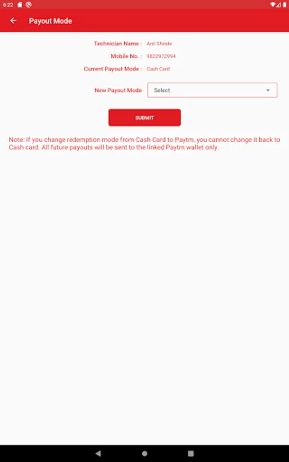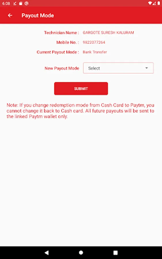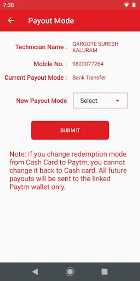 3. Payout Mode : AHE can update and view current payout mode of particular technician.