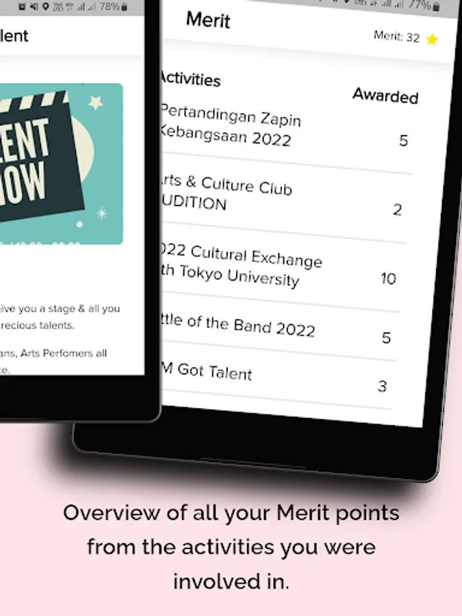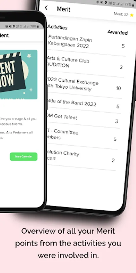 Overview of all your Merit points with just one tap from the activities you were involved in!