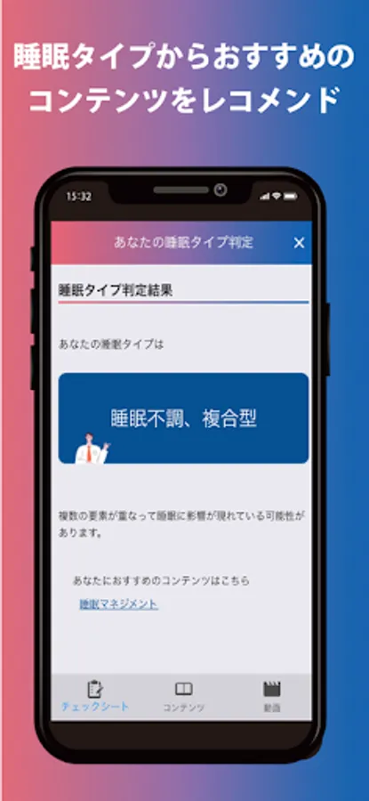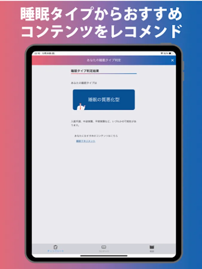 "MATOUS Sleep Concierge Biz" is an app that gives you a deeper understanding of "sleep", one of the three elements that support your health, and gives you tips on how to improve your sleep habits.