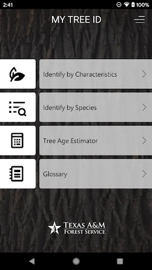 My Tree ID, developed by Texas A&M Forest Service, facilitates tree species identification based on leaves, flowers, seed, bark or location using a key, descriptions, and tree images. It contains over 1500 images from 475 different tree species and includes known occurrence maps from the Biota of North America Program for nearly all species. Individual tree detail pages have complete descriptions including interesting facts and similar species. The map feature allows users to input an address, select current location, or click on any point on the map to narrow the list. A full glossary and a tree age estimator tool complement the key and species list.