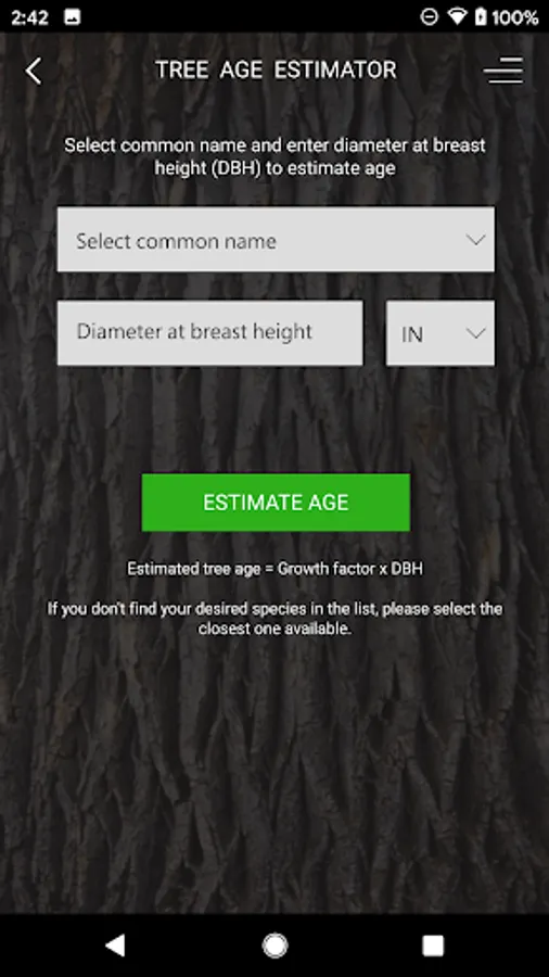 The tree estimator tool uses a species growth factor and tree diameter to provide a rough approximation of tree age. The app uses published growth factors and only a limited number are available. However, this serves as a starting point for estimating individual tree age.