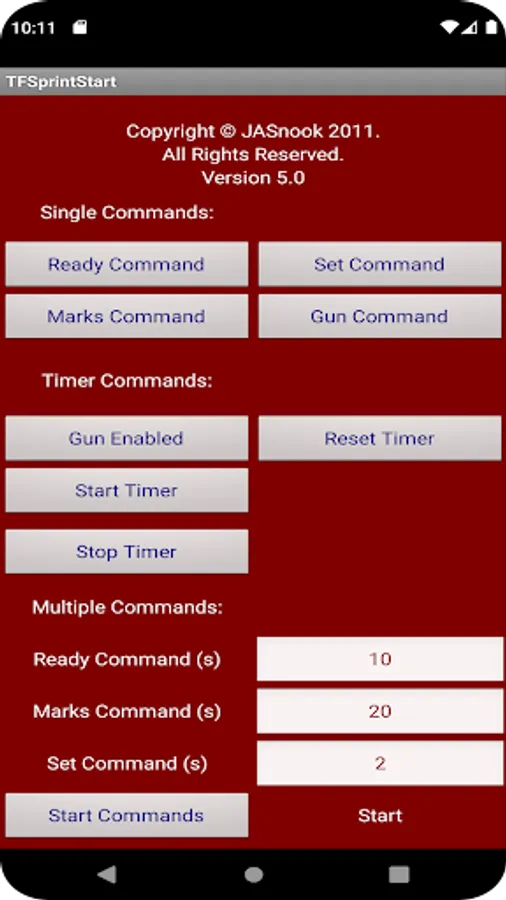 Multiple Start commands provided include Ready Signal, On Your Marks, Set, & Gun Fired. Adjustable parameters provide delay time between each Command. Set parameter has a random component.