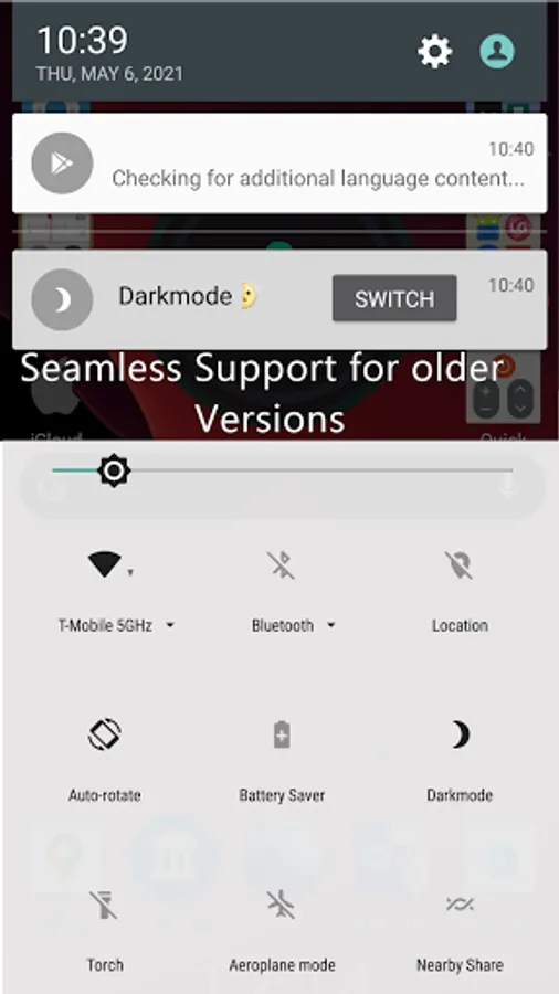 Furthermore with you are using an older Android Phone which doesn't support the Dark System Theme in Android 10.0 - no problem. For Android 7,8 and 9 I have created a custom quick settings tile that allows you to enable Darkmode. It even works with certain 3rd party Apps. For Android 6 devices you have the option to Toggle Darkmode with a custom Notification.