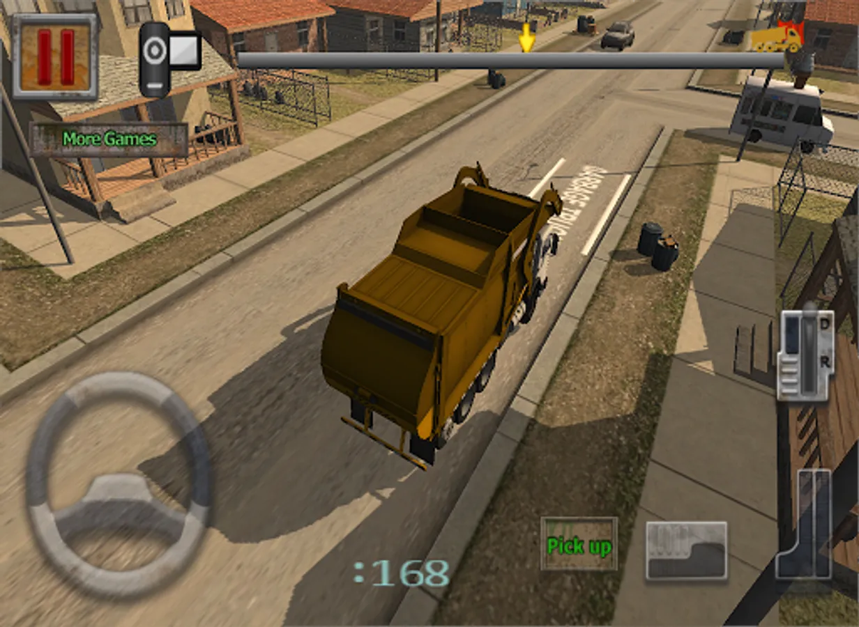 Follow the on screen map to find your next garbage container location. As the waste driver it’s your responsibility to empty these garbage containers. Park your city garbage truck on the parking spot and the garbage vehicle will do the rest…