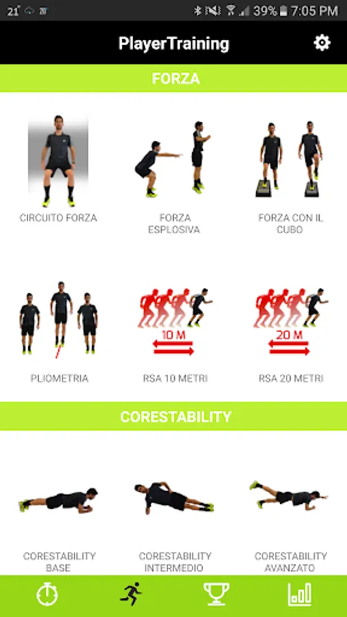 You can choose among 19 training programs divided into 4 categories: Strength, Running, Core Stability and Prevention. You can also use the Challenge Option that will give you different training sessions every day for a period of 2/3 weeks. The Challenge Option is studied for players who need to get back into good condition before the usual preparatory phase of a team or after a period of inactivity.