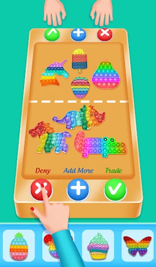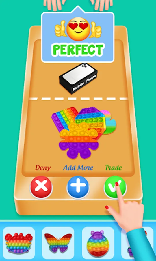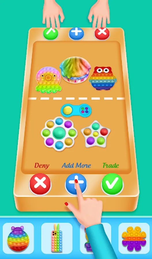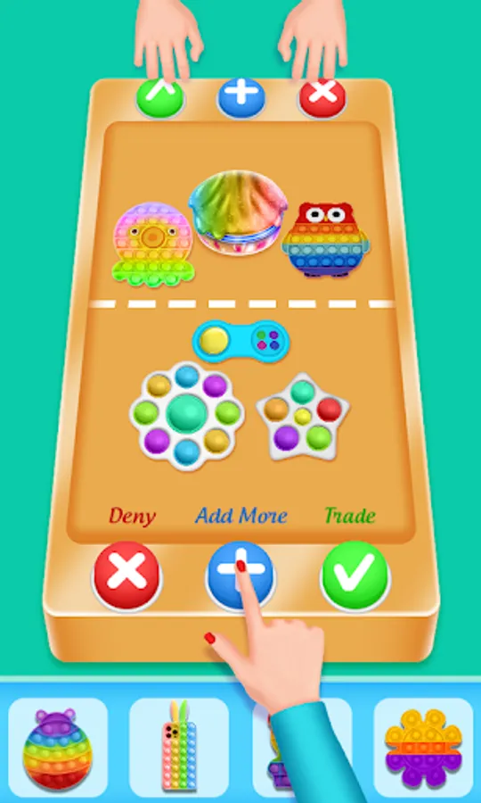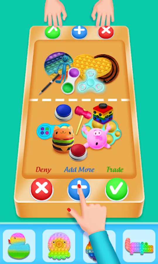 Simple mechanics. There are three buttons for trade plus for more, tick for accept, cross for reject. Obtain new colorful fidgets in one click. Fidget trading has never been easier.