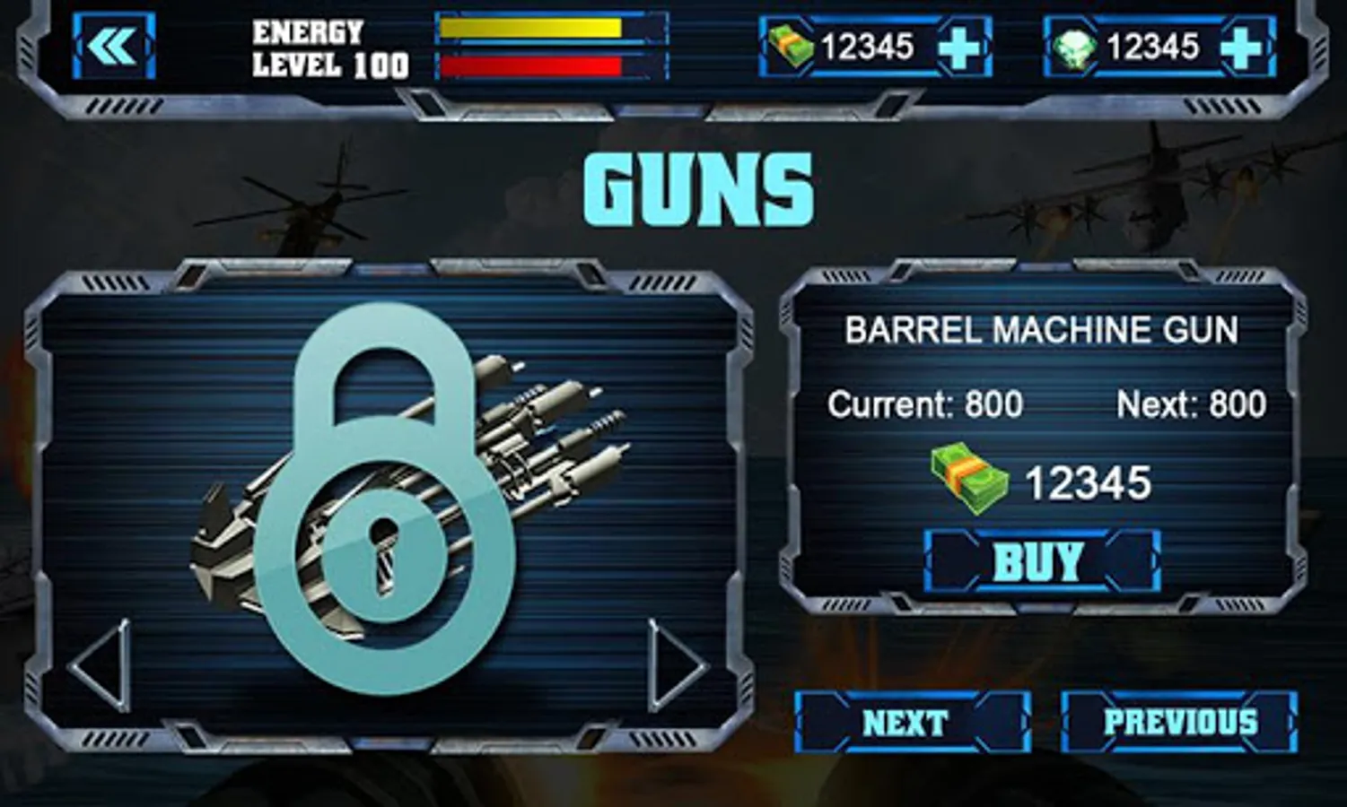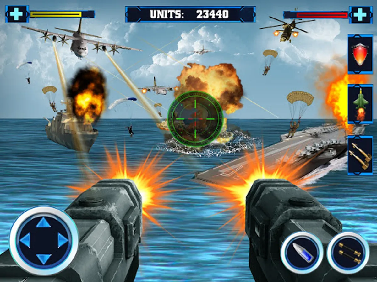 This is a battleship shooting game with several types of military ships, paratrooper soldiers, gunship helicopters, war jets and battle copters