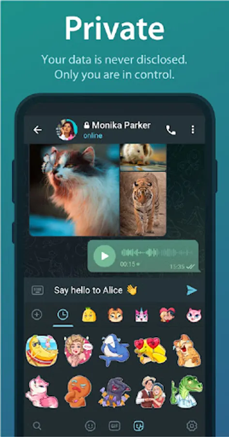 • Send text and voice messages, photos and videos, files, documents, links, GIFs, etc.;