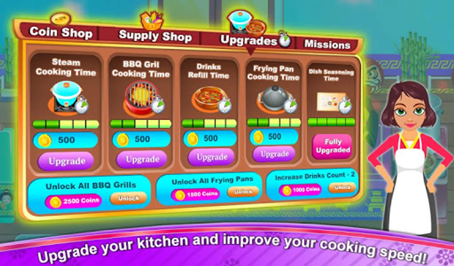 The kitchen is full with ingredients and kitchen gear which you can upgrade to speed up your cooking time!