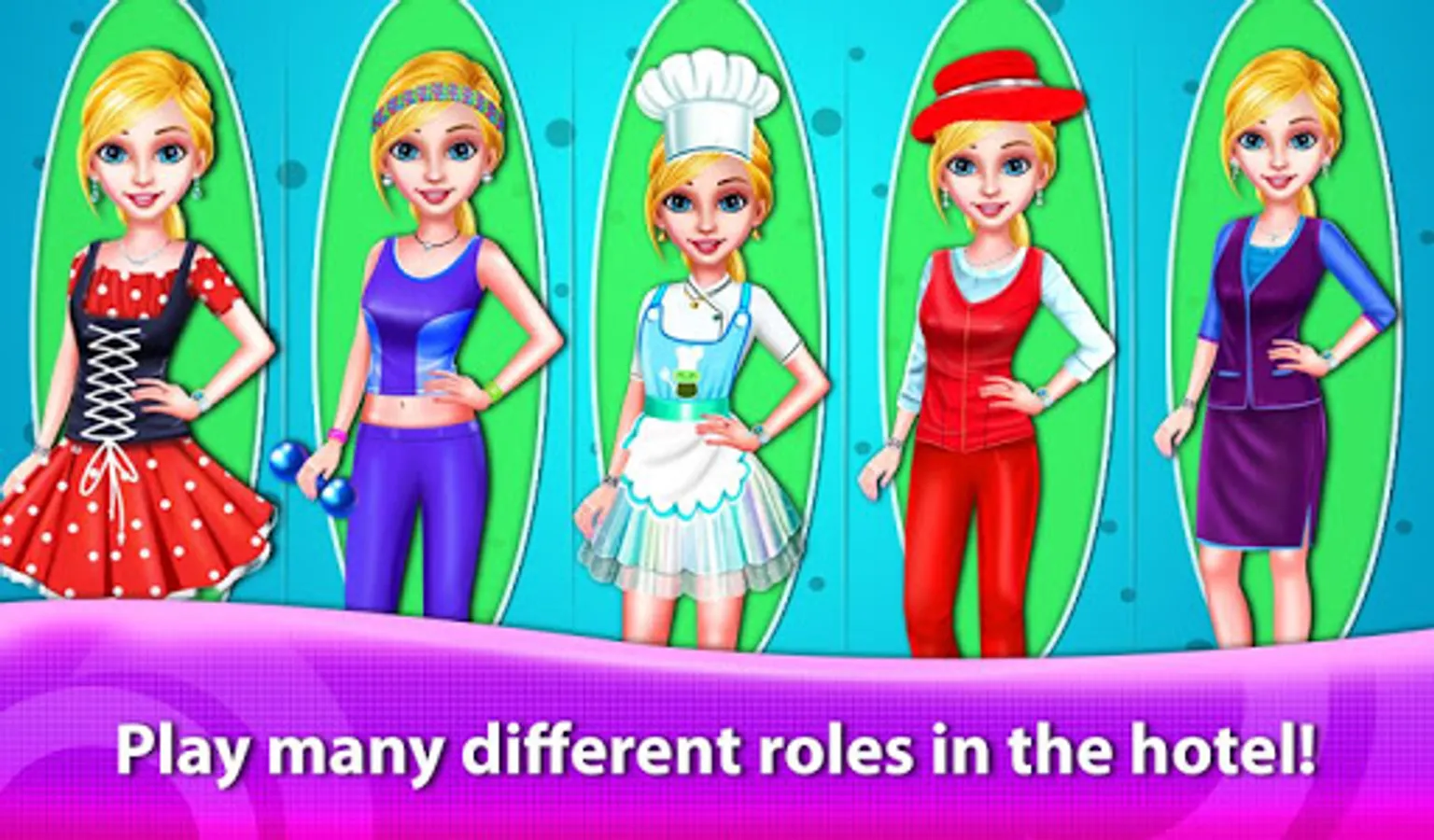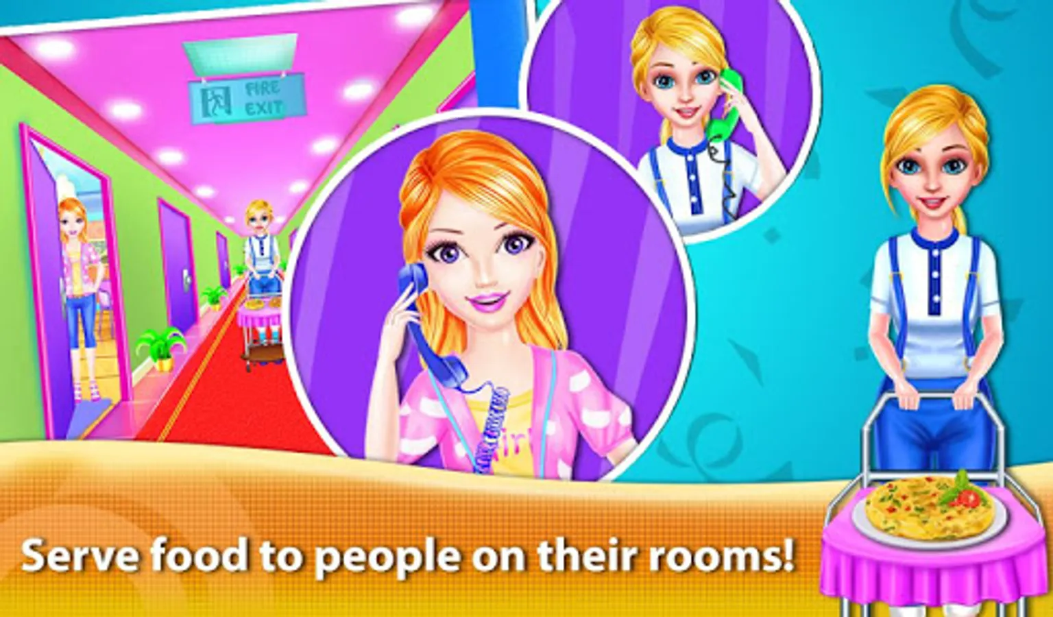 Welcome at your first day as girl hotel hostess in Resort Paradise! Serve the guests food and drinks in the hotel restaurant or juice bar, treat them in the spa / beauty salon or cleanup the room before new guests arrive in your reception. Explore all rooms in the hotel, make your guests happy and become the most famous hotel in the world!