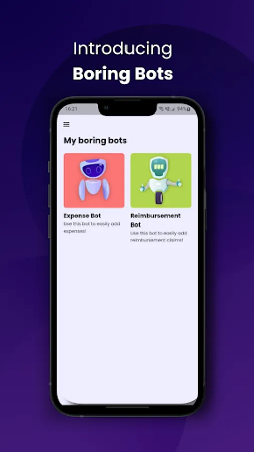 The Boring Bots mobile app is intended for employees of an organisation to access bots from the comfort of their phones.