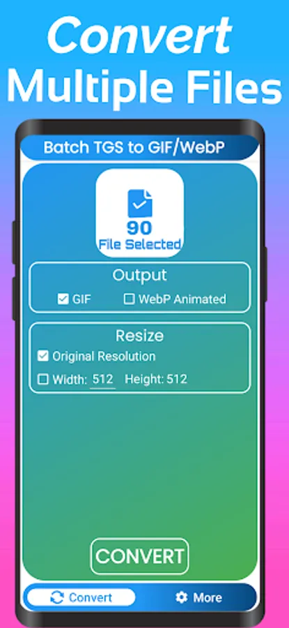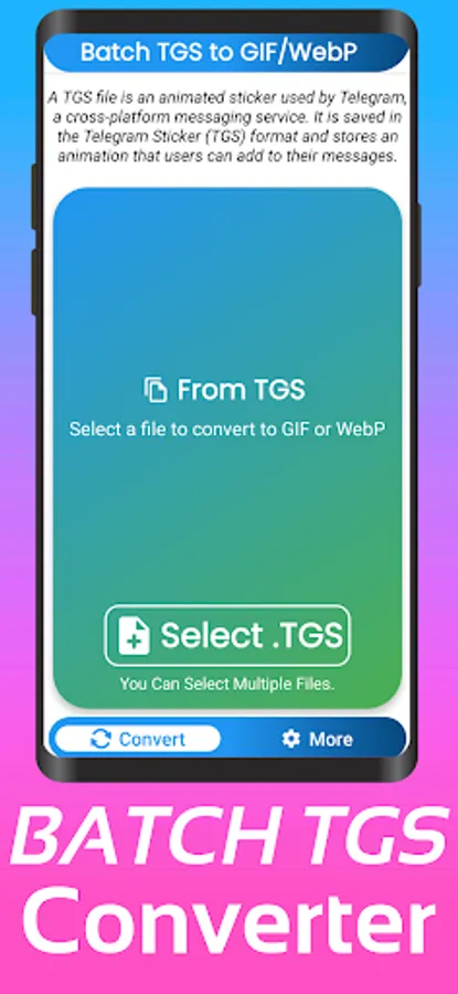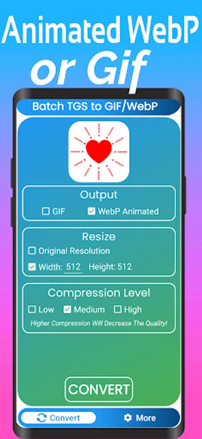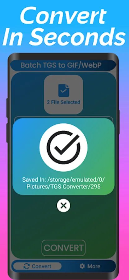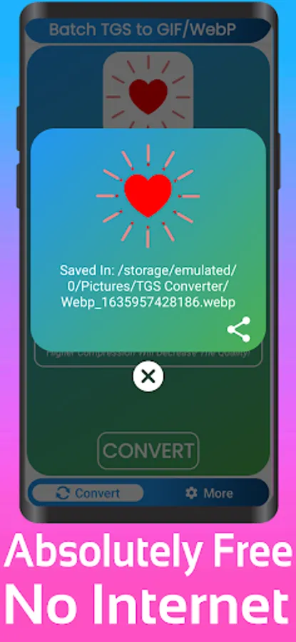 This App allows you to Convert your Animated TGS file and Lottie Files Json to Gif or Animated Webp or Webp in seconds with Batch Support