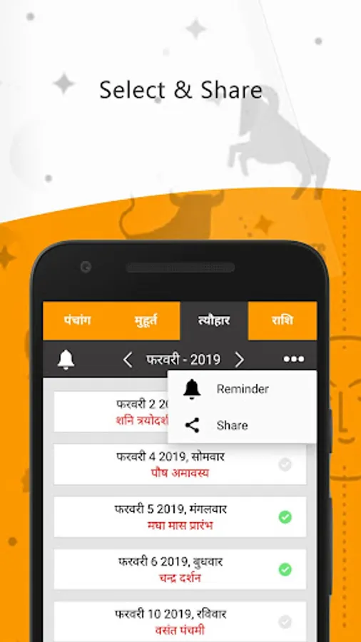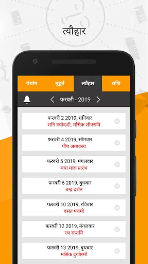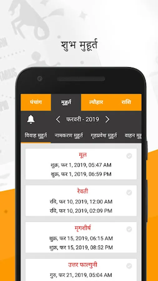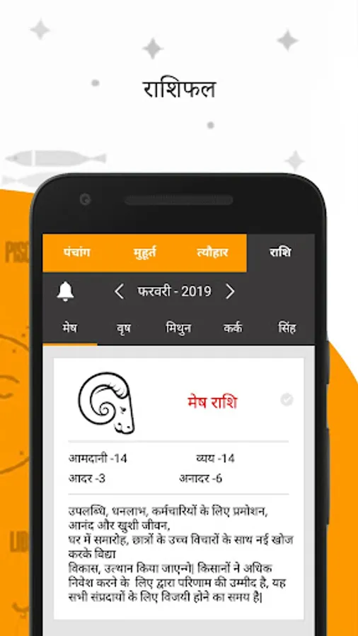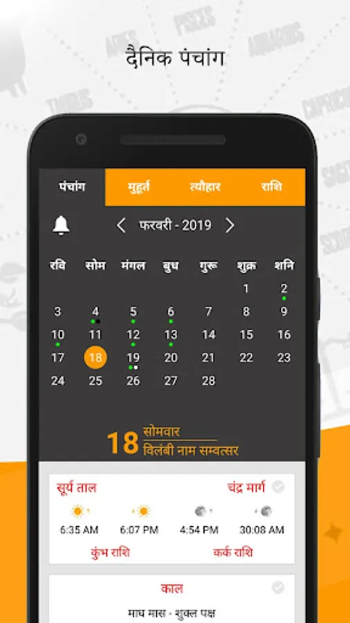 Hindi calendar 2020 comes with four main tabs like Panchangam, Muhurtham, Festivals(Pandugalu), Rashifal(Horoscope).