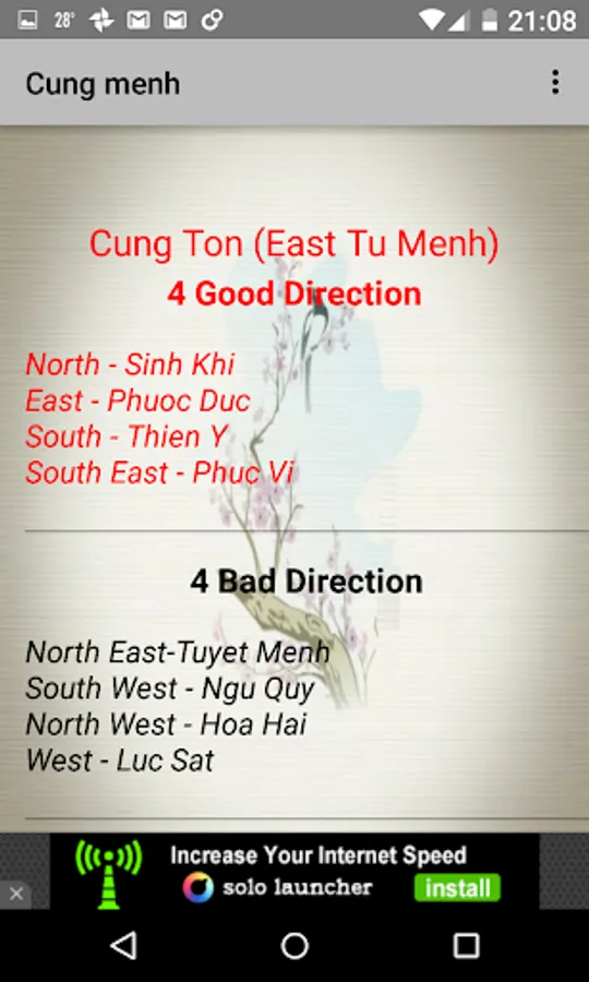 Do you know, the direction of house is very very important for everyone in Feng Shui science. Each person will have lucky direction and unlucky direction depend on the lunar year birthday. "My lucky Direction" is software for you to find lucky direction for you. You can choose the your lucky direction for choose house, choose direction in office,...