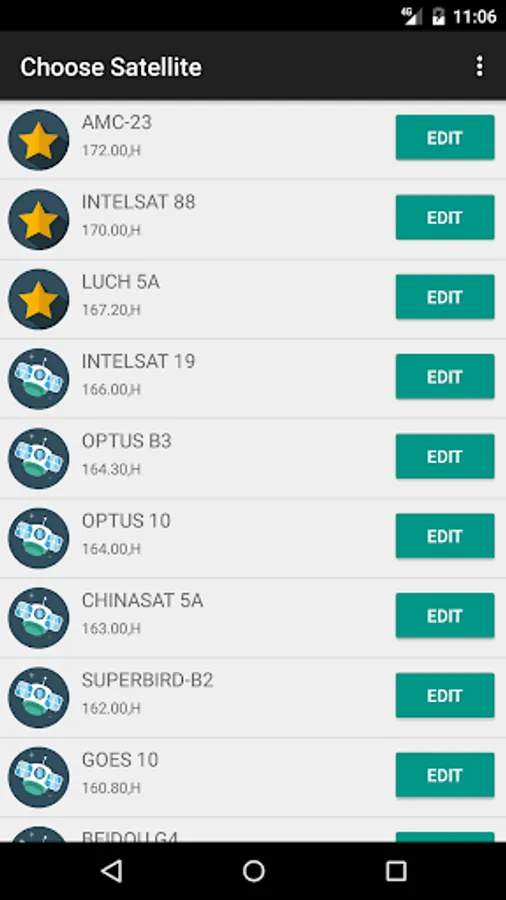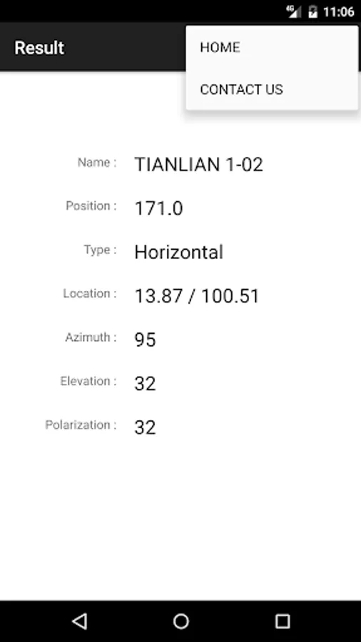 You will have access to a list of more than 400 satellites. Once a satellite has been selected, you will be able to read number of information necessary to your installation, such ass its geographical zone (region/country), its position (longitude East or West), its elevation and azimuth as calculate based on your location.