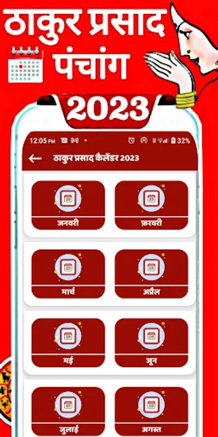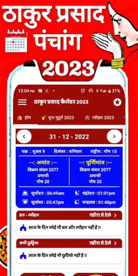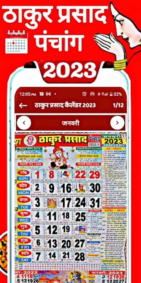 The Thakur Prasad Panchang 2023 app contains high quality monthly images which allow you to see information of fish, wind, constellation and all holidays in Hindi in 2022 for all days.