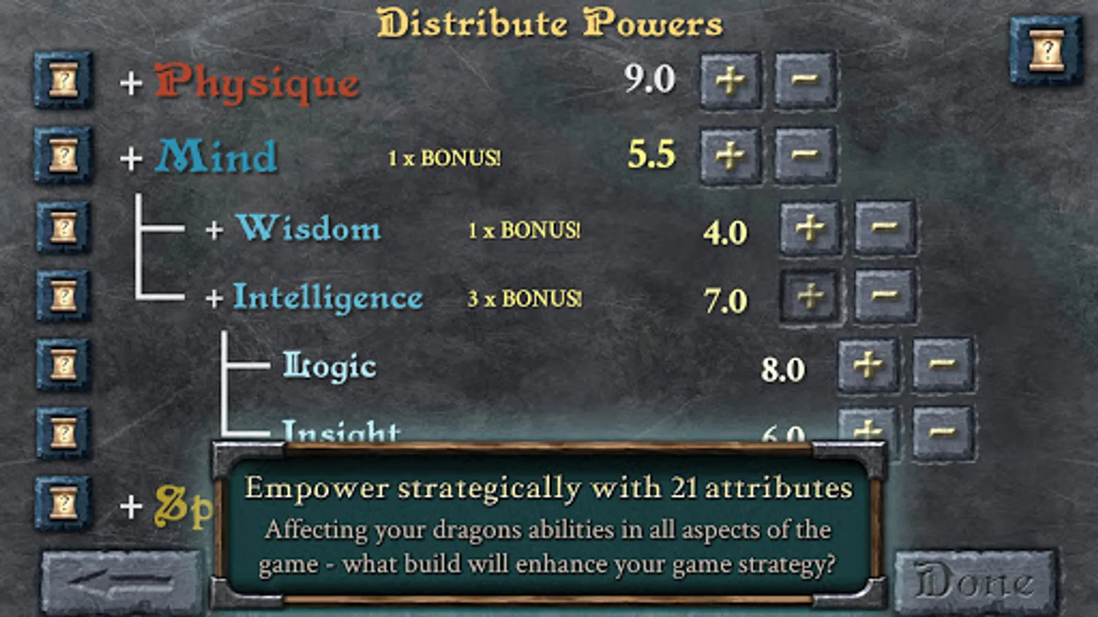 Build your dragon strategically to fit your play-style through increasing 21 stats, all affecting the dragons ability in different aspects of the game.